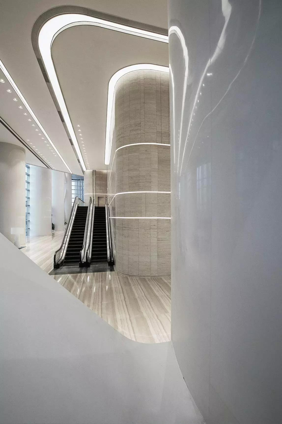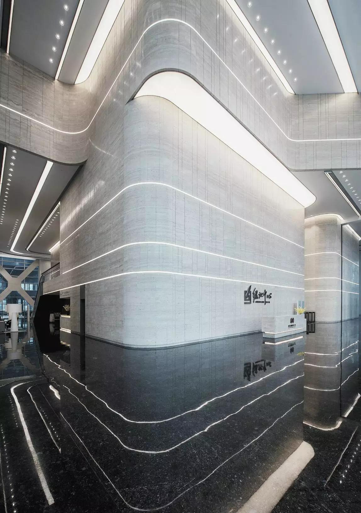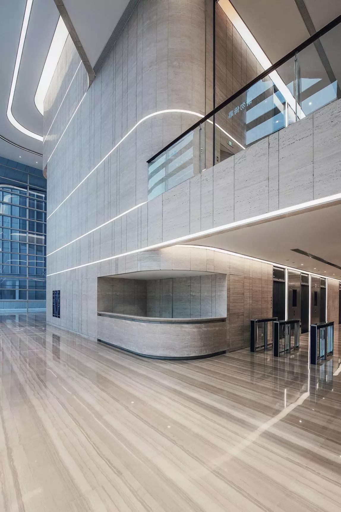 大堂設計將空間塑造作為首選,將形式、質感、光與影等要素組合融入,創(chuàng)造性的表達空間的品質和精神,放棄了多余的裝飾與造型,著重展現(xiàn)室內空間與建筑空間的統(tǒng)一性。